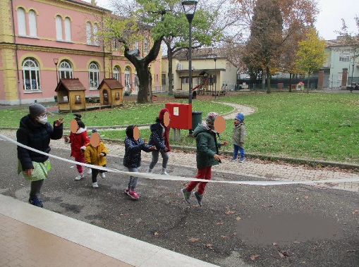 In quel momento il cortile della scuola Carducci a Cesena si rivelava una straordinaria risorsa per la comunità scolastica che vi si affacciava, meritando in seguito la sua candidatura a Luogo del Belsentire. Anche nei mesi di novembre, dicembre, gennaio e febbraio, qualsiasi fossero le condizioni metereologiche, la musica dal vivo e il libero movimento, ma soprattutto il canto, potevano continuare ad essere pratiche abituali della quotidianità educativa dei bambini, ancor più significativa e profonda nell’aula a cielo aperto o al riparo del solo porticato esposti alla vista dei tanti cambiamenti naturali del giardino.