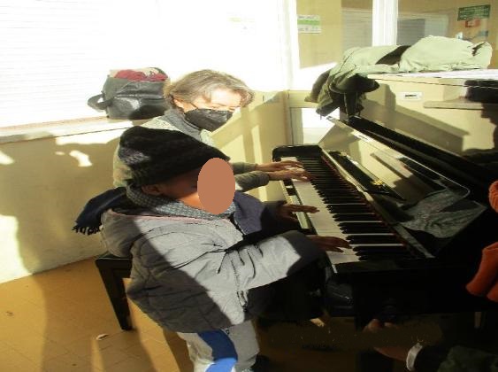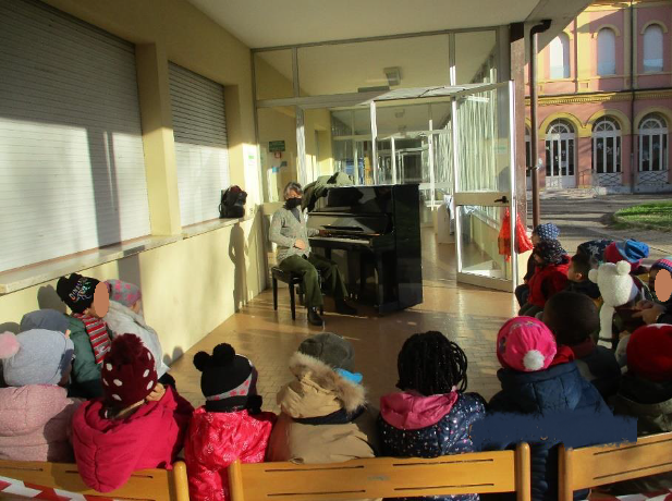 Il noleggio di un pianoforte acustico posizionato nel porticato prospicente il cortile e riparato nei corridoi delle cucine a fine mattinata, e l’allestimento con alcune panche della sezione trasportate allegramente ogni settimana con l’aiuto dei bambini stessi, trasformava però il cortile in una seconda aula di musica, “replica” di quella quasi inutilizzabile in interno.